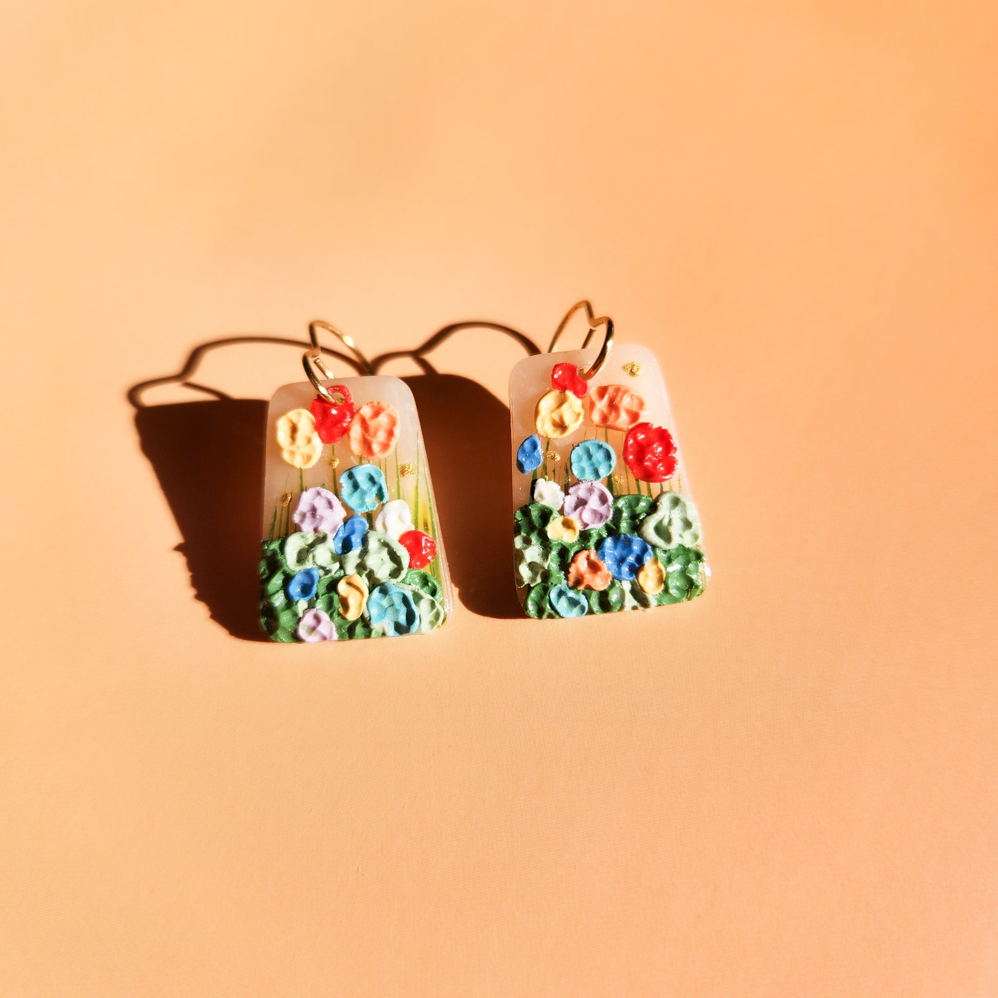 The Garden dangle earrings are handcraftet polymer clay earrings made with care and intention from start to finish. Each pair is beautifully unique from one to the next. Very lightweight and easy to wear for even the most sensitive ears.
